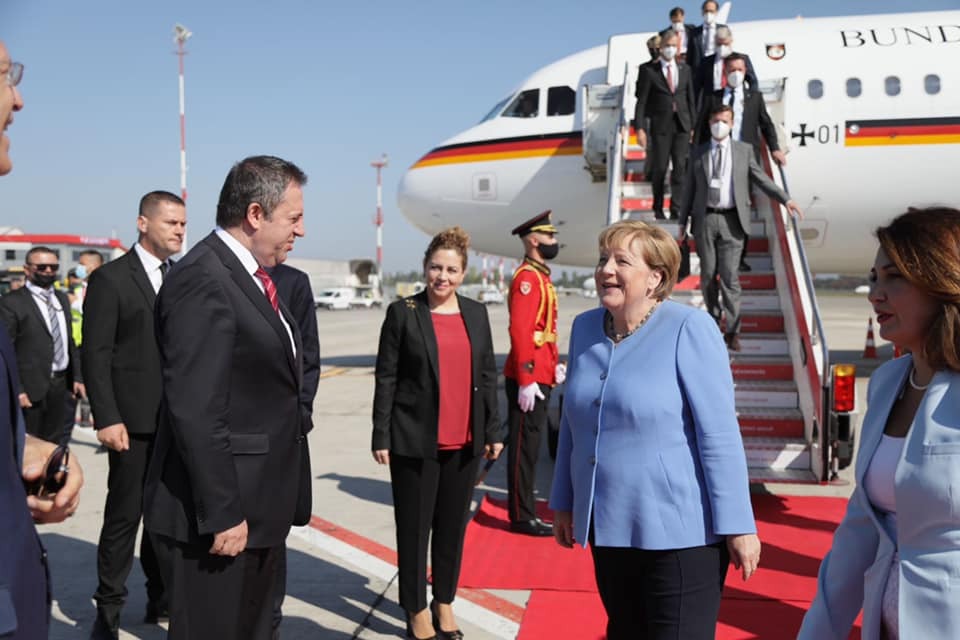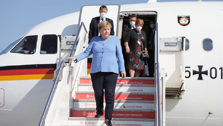 E veshur me një xhaketë ngjyrë bojëqielli që simbolizon natyrën serioze të takimeve, kancelarja mbërriti në Tiranë, ku pas takimit me kryeministrin Edi Rama do të zhvillojë takime edhe me liderët e tjerë të Ballkanit Perëndimor në qendrën Tirana Bussiness Park.
