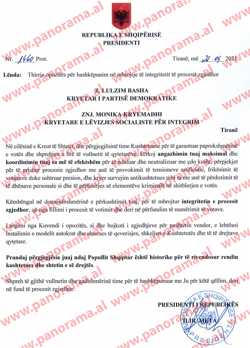 Në këtë letër, Presidenti Meta kërkon nga dy liderët e partive opozitare që të angazhohen maksimalisht dhe të koordinohen për të ndaluar dhe neutralizuar “me çdo kusht përpjekjet, për të prishur procesin zgjedhor me anë të provokimit të tensioneve artificiale, frikësimit të votuesve duke ushtruar presion, dhe kryer survejim antikushtetues mbi ta me anë të përdorimit të të dhënave personale si dhe të përfshirjes së elementëve kriminalë në shitblerjen e votës”.