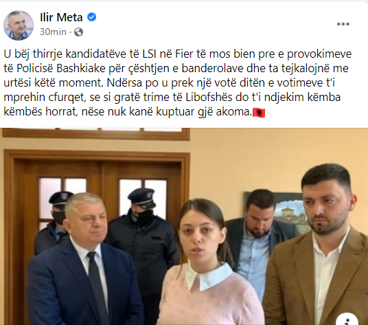Presidenti Meta ka reaguar me tone kërcënuese pas denoncimit të kandidates së LSI-së, Kejdi Mehmetaj, se policia në Fier po heq banerat e kësaj partie, pasi pritet të shkojë kryeministri Edi Rama për takimin e fundit elektoral.