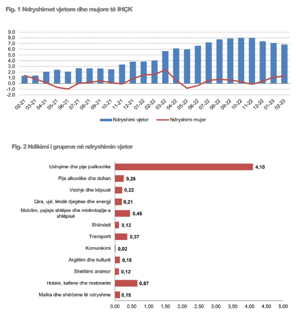 Në muajin shkurt 2023, ndryshimi mujor i matur nga Indeksi i Harmonizuar i Çmimeve të Konsumit është 1,3%. Ky ndryshim është ndikuar kryesisht nga rritja e çmimeve të grupit “Ushqime dhe pije joalkoolike” me 3,9%, pasuar nga grupet “Mobilim, pajisje shtëpie dhe mirëmbajtje” me 0,9%, “Pije alkoolike dhe duhan” me 0,6%, “Mallra dhe shërbime të ndryshme” me 0,3%, “Argëtim dhe kulturë” me 0,2%, “Qira, ujë, lëndë djegëse dhe energji” dhe “Shëndeti” me 0,1% secili.