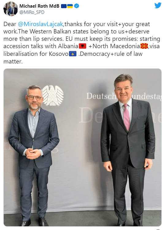 “I nderuar Miroslav Lajcak, faleminderit për vizitën dhe punën tuaj. Shtetet e Ballkanit Perëndimor i përkasin Evropës dhe meritojnë më shumë se vetëm fjalë. BE-ja duhet t’i mbajë premtimet e veta: Të fillojë bisedimet e anëtarësimit me Shqipërinë dhe Maqedoninë e Veriut, liberalizimin e vizave për Kosovën. Demokracia dhe rendi e ligji janë të rëndësishme”, ka shkruar Roth në Tweeter.