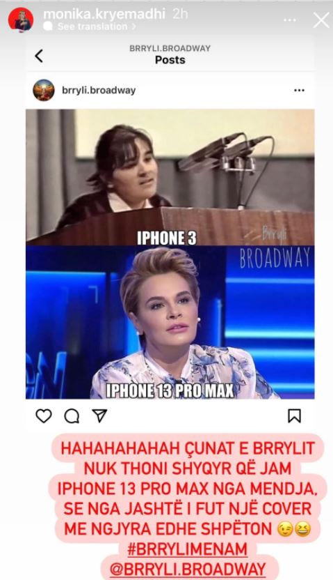 Me anë të një postimi në Instagram Kryemadhi i ka kthyer përgjigje faqes, “Brryli Brodway” duke shkruar se “nuk thoni shyqyr që jam Iphone 13 pro max nga mendja, se nga jashtë i fus një cover me ngjyra dhe shpëton”.