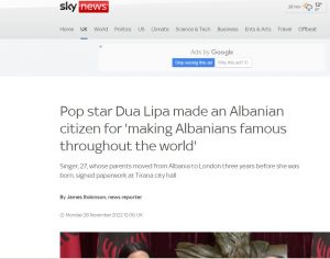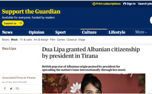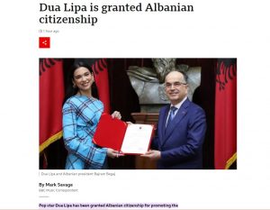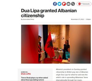 Në nder të shpalljes së pavarësisë së Shqipërisë, Dua Lipa mori nënshtetesinë shqiptare, e cila u prit ditën e djeshme në Presidencë së bashku me familjen e saj. Dua-s iu dorëzua nënshtetësia shqiptare nga Presidenti i Republikës, Bajram Begaj. E këtij momenti i kanë bërë jehonë mediat më prestigjoze botërore.