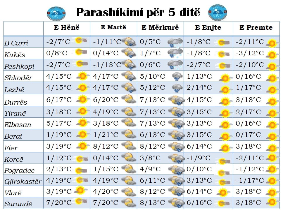Që prej orëve të para të 24 orëshit të ditës së mërkurë, reshjet e shiut do të përfshijnë pjesën më të madhe të vendit, me intensitet deri mesatar dhe në veriperëndim me prani shtrëngatash. Në veri e verilindje, reshjet e dëborës përkohësisht do të fitojnë terren deri në kuotat kodrinore. Në lindje e juglindje, dëborë e dobët në majat e maleve. Kjo situatë, do të jetë e përkohshme, pasi ditët e enjte dhe të premte do të karakterizohen nga mot i qendrueshëm me diell.