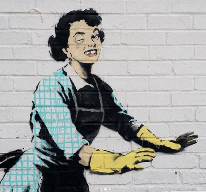 Me rastin e Ditës së Shën Valentinit, artisti i rrugës donte të dërgonte një mesazh kundër dhunës ndaj grave duke përshkruar një shtëpiake stereotipike të viteve 1950 me sy të nxirë dhe një dhëmb që i mungon, e cila mbyll kapakun e një frigoriferi të vjetër nga i cili dalin një palë këmbë. Janë ato të burrit të saj që e dërgoi në atë gjendje.