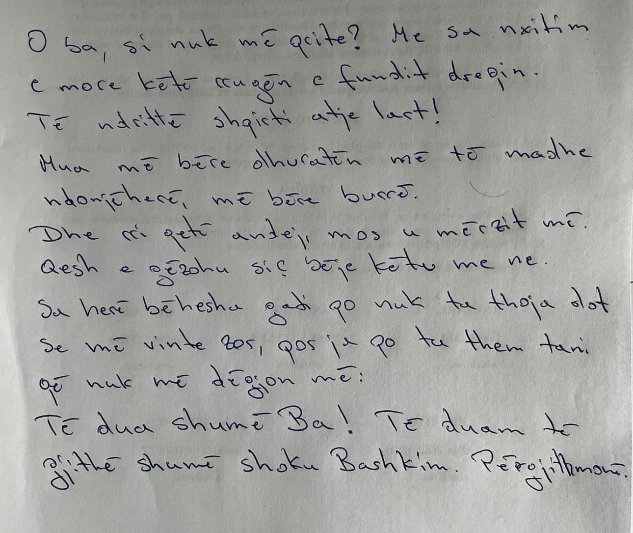 “O Ba si nuk më prite”, e nis letrën e tij ish-ministri, i cili ndër të tjera shton ”më bëre dhuratën më të madhe ndonjëherë, më bëre burrë”.