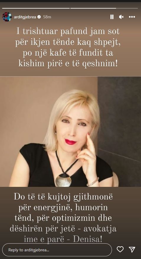 “I trishtuar pafund jam sot për ikjen tënde kaq shpejt, po nje kafe te fundit ta kishim pire e tè qeshnim! Do te te kujtoj gjithmone per energjine, humorin tend, per optimizmin dhe deshiren per jete. Avokatja ime e pare – Denisa!”, ka shkruar Gjebrea.