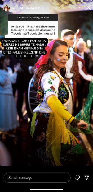 “Tropojanët janë fantastik! Njerëzit me shpirt të madh. Këtë e kam mësuar dita ditës falë Shkëlzenit dhe fisit të tij”,- shkroi Mevlani. Krahas këtij mesazhi, Armina vendosi një foto nga dasma e saj ku u vesh me veshje tradicionale tropojane.