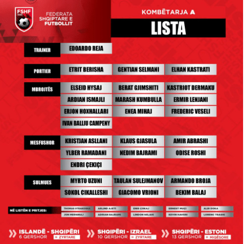 Departamenti i Komunikimit në FSHF bën me dije se trajneri i Shqipërisë, Edoardo Reja ka zyrtarizuar edhe listën me emrat e 26 lojtarëve që janë ftuar për këto tre sfida.
