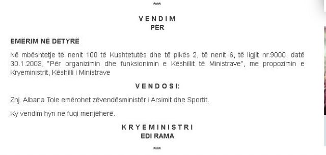Znj. Albana Tole emërohet zëvendësministër i Arsimit dhe Sportit.