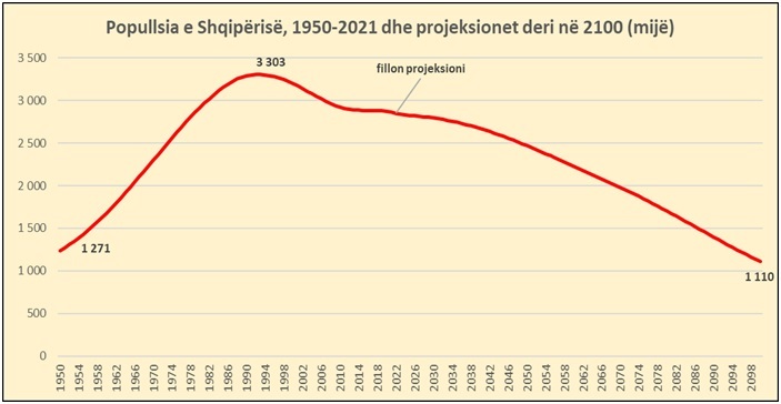 Kombet e Bashkuara presin që popullsia totale banuese në vend, në vitin 2100, sipas variantit mesatar, do të zbresë në 1.1 milionë banorë (shiko grafikun: Popullsia e Shqipërisë 1990-2021 dhe projeksioni 2022-2100).