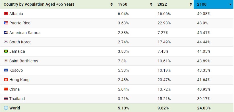 Llogaritjet janë bërë nga njësia e përpunimit të të dhënave “Visual Capitalist”, që ka analizuar të dhënat e divizionit të popullsisë të Organizatës së Kombeve të Bashkuara (OKB). Sipas parashikimeve, 49% e popullsisë së Shqipërisë do të jetë 65 vjeç e lart deri në vitin 2100, pesha më e lartë në botë dhe dyfishi i mesatares globale deri në atë vit.
