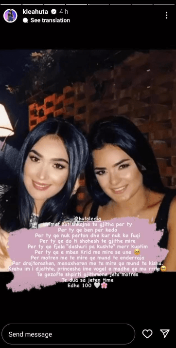 “Urime sot shkojnë të gjitha për ty. Për ty që bën për këdo. Për ty që nuk përton dhe kur nuk ke fuqi. Për ty që do t’i shohësh të gjithë mirë. Për ty që fjala “dashuri pa kushte” merr kuptim. Për ty që e mban Krid më mirë se unë. Për motrën më të mirë që mund të ëndërroja, drejtoreshën, menaxheren më të mirë që mund të kisha. Krahu im i djathtë, princesha ime e vogël, e madhe që m’u rrite. Të gëzoftë shpirti gtjithmonë, jeta motrës. Të dua sa jetën time. Edhe 100”,-shkroi Klea në postimin e saj.