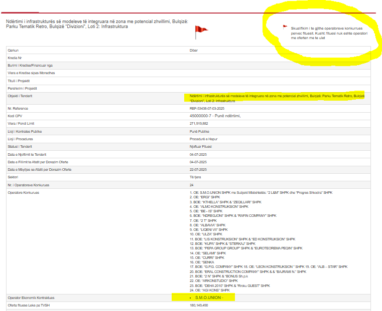 Fondi limit i tij është 547,562,825 lekë të reja pa TVSH ose rreth 6.5 miliardë lekë të vjetra me TVSH. Sipas dokumenteve, fitues është shpallur bashkimi i operatorëve “S.M.O. UNION” (në pronësi të Xhevat Vataksi, Fernand Nuha dhe Mehdi Shabani) + “BLERIMI” (në pronësi të Besmir dhe Behexhet Uruçit) + “SMO VATAKSI” (në pronësi të Xhevat Vataksi).