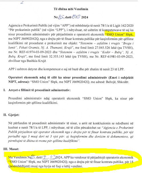 Me vendimin e mësipërm APP ka vendosur të përjashtojë operatorin ekonomik “SMO Union” Shpk, me NIPT J66902042Q, nga e drejta për të fituar kontrata publike, për 15 muaj nga hyrja në fuqi e këtij vendimi.