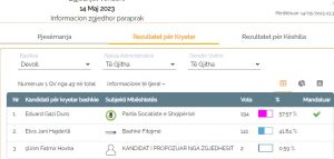 Kandidati i majtë Eduard Duro ka marrë 191 vota, kandidati i koalicionit “Bashkë Fitojmë” Elvi Hajdërlli ka marrë 141 vota, ndërsa kandidati i PD, Çlirim Hoxha vetëm dy vota.
