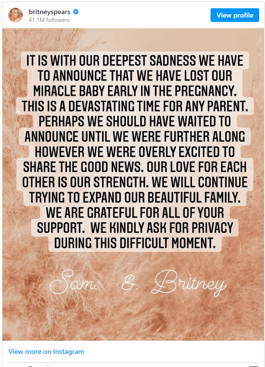 “Me pikëllimin më të thellë duhet të njoftojmë se kemi humbur fëmijën tonë të mrekullueshëm, herët në shtatzëni”, shkroi Spears në Instagram. “Kjo është një periushë shkatërruese për çdo prind.”
