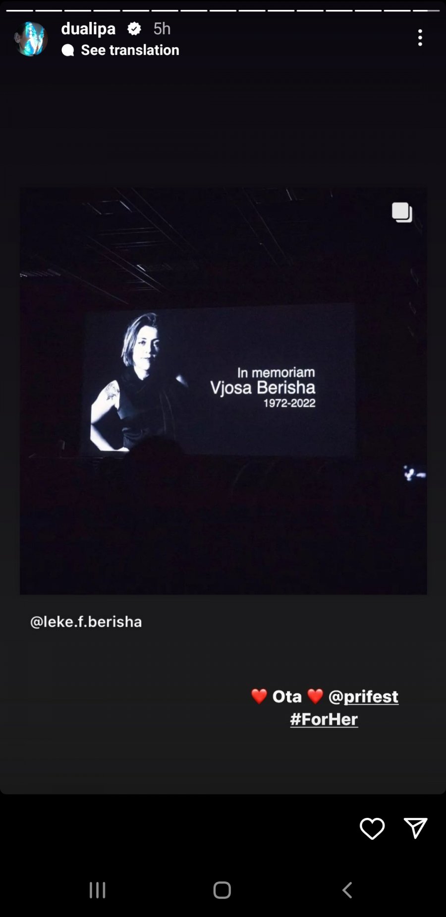 Ajo ka shpërndarë në ‘Instagram’ postimin e bashkëshortit të regjisores së ndjerë i cili shkruan: “Faleminderit shumë të gjithëve për mbështetjen dhe fjalët e mira që dhatë këtë javë për Vjosën. Faleminderit shumë gjithë stafit dhe vullnetarëve të ‘Prifest’ për punën e palodhshme. Na keni lehtësuar sadopak dhimbjen e papërshkrushme që po e ndjejmë në mungesë të saj. Ndërkohë Dua ka shtuar krah postimit: “OTA, PRIFEST! Për të!”