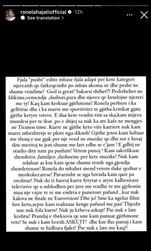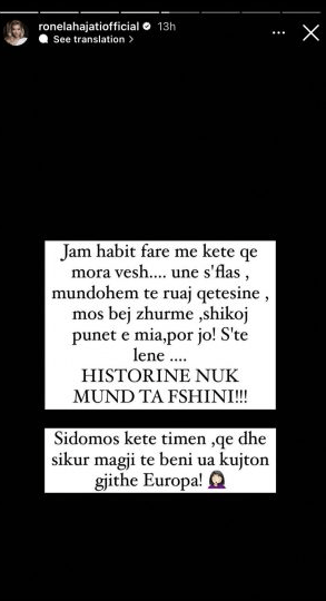 “Jam habit fare me këtë që mora vesh…. une s’flas, mundohem të ruaj qetësinë, mos bej zhurmë, shikoj punët e mia, por jo! S’të lënë … HISTORINE NUK MUND TA FSHINI!!! Sidomos këtë timen, që dhe sikur magji të bëni ua kujton gjithë Europa!”– shkruan Ronela në një Instastory.