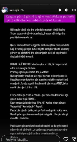 Në faqen zyrtare të Instagramit të këngëtarit Luiz Ejlli ka pasur një reagim nga të afërmit e tij pas gjuhës ofenduese dhe kërcënuese të përdorur ndaj tij nga aktorja Olta gixhari.