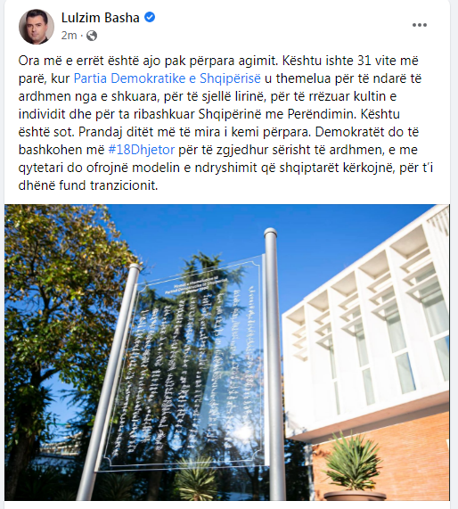 “Ora më e errët është ajo pak përpara agimit. Kështu ishte 31 vite më parë, kur Partia Demokratike e Shqipërisë u themelua për të ndarë të ardhmen nga e shkuara, për të sjellë lirinë, për të rrëzuar kultin e individit dhe për ta ribashkuar Shqipërinë me Perëndimin.