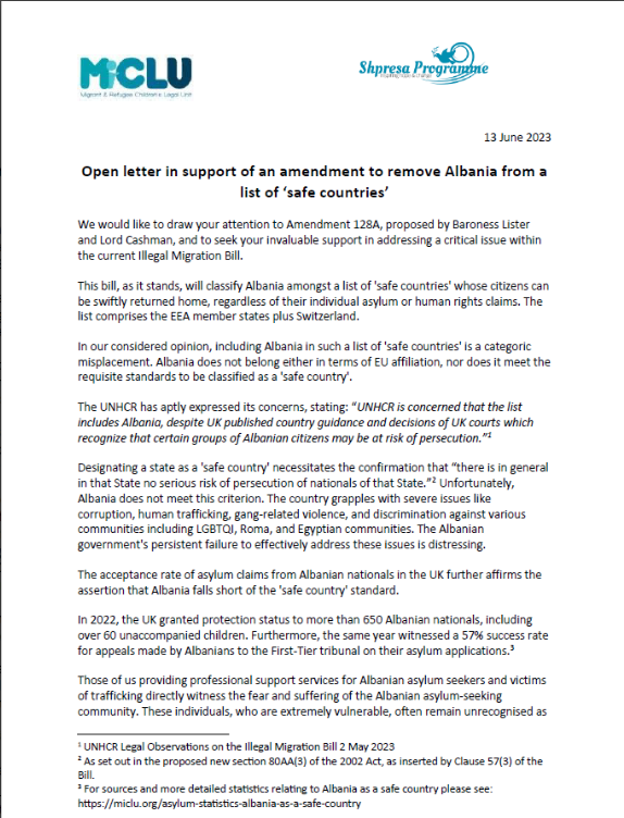 “Ne dëshirojmë të tërheqim vëmendjen tuaj për Amendamentin 128A, të propozuar nga Baronesha Lister dhe Lord Cashman, dhe për të kërkuar mbështetjen tuaj të paçmuar në adresimin e një çështjeje kritike brenda Projektligji aktual i Migracionit Ilegal. Ky projektligj, siç është, do ta klasifikojë Shqipërinë në një listë të ‘vendeve të sigurta’ qytetarët e të cilëve munden të kthehen me shpejtësi në atdhe, pavarësisht nga kërkesat e tyre individuale për azil apo të drejtat e njeriut. Lista përfshin shtetet anëtare të EEA plus Zvicrën.