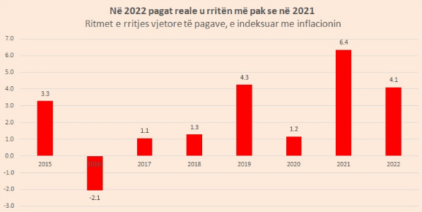 Sipas të dhënave të INSTAT paga mesatare mujore bruto arriti në 66,015 lekë në fund të vitit 2022 me një rritje 10.8 për qind në krahasim me vitin 2021. Por paga reale që merr në konsideratë indeksimin me inflacionin u rrit me vetëm 4.1 për qind, një ritëm ky më i ulët se i vitit 2021 kur paga reale në ekonomi u rrit me 6.4%.
