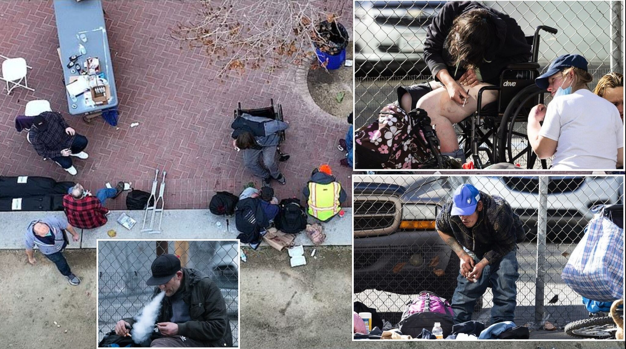 Shumë të tjerë janë ulur në tokë mes plehrave, kontejnerëve të zbrazët të ushqimit dhe batanijeve të pista, ndërsa zhyten me mjete droge në mot të ftohtë.