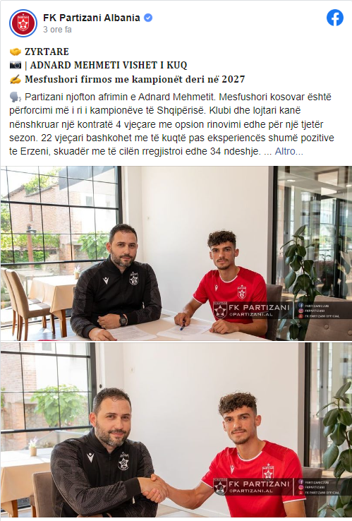 Klubi i Partizanit ka bërë pak çaste më parë të ditur se kanë arritur marrëveshjen dhe firmën me talentin 22-vjeçar nga Kosova.
