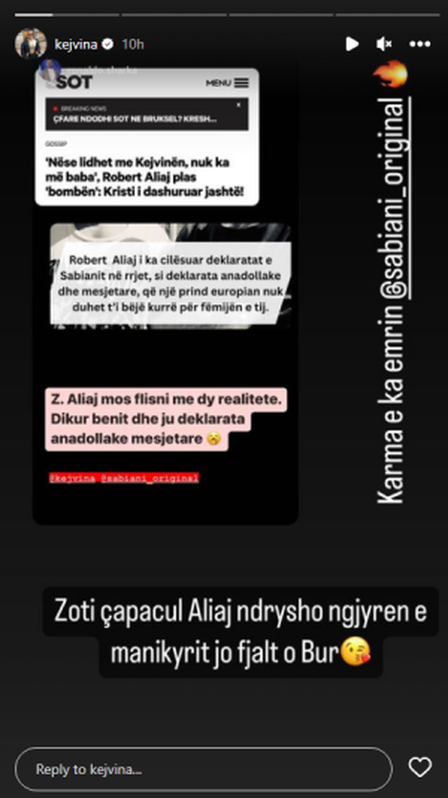 Të gjitha këto reagime, Kejvina i ka përmbledhur në një postim në Instastory, krahas së cilit shkruan: “Zoti çapaçul Aliaj, ndrysho ngjyrën e manikyrit jo fjalët o Bur”.