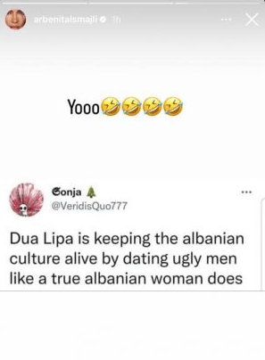 Së fundmi, modelja e njohur Arbenita Ismajli, ka ndarë me ndjekësit e saj një shprehje ku thuhet: “Dua Lipa po mban gjallë kulturën shqiptare, pasi po del me meshkuj të shëmtuar siç bëjnë gratë shqiptare.”