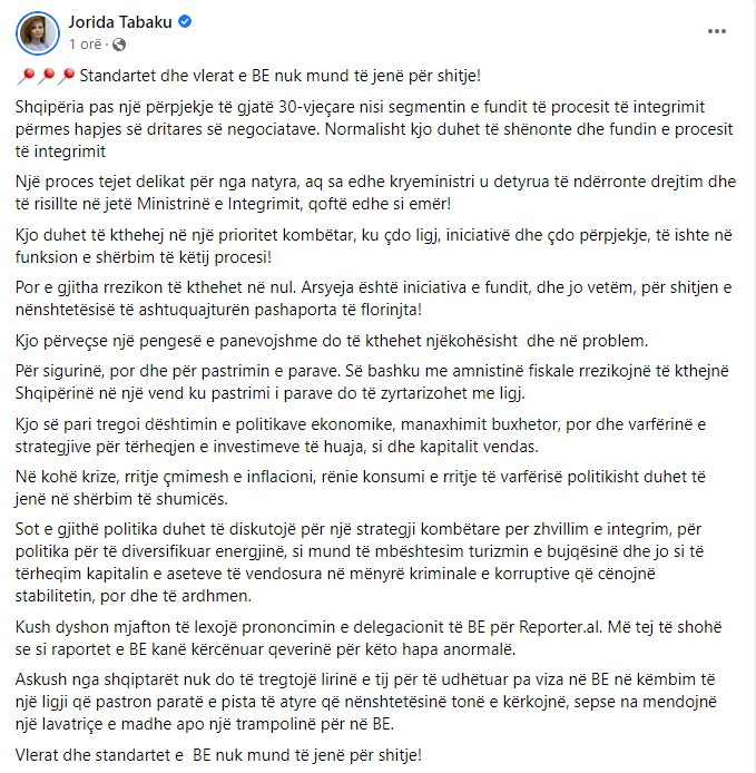 Deputetja e PD, Jorida Tabaku ka reaguar në lidhje me shitjen e pasaportave shqiptare.