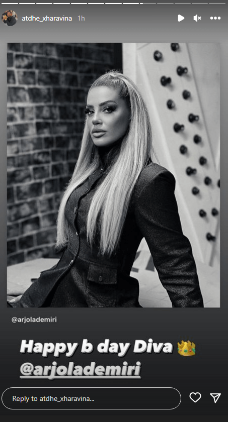 Raporti mes ish-konkurentit të ‘Për’puthen’, Atdhe Xharavina dhe aktores Arjola Demiri ka qenë me ulje-ngritje dhe dyshja janë komentuar së fundmi për një krisje mes tyre. Por veprimi i fundit i Atdheut i ka dhënë fund dyshimeve. Sot ish-banorja e “Big Brother Vip” feston ditëlindjen dhe mes shumë urimeve nga miqtë dhe kolegët e saj, nuk ka munguar një urim publik as nga ana e Atdheut. Ish-konkurenti i “Për’puthen” ka ndarë në ‘Instastory’ një foto të aktores, krahas së cilës shkruan: “Gëzuar ditëlindjen Diva”,- shoqëruar me një emoji kurore.