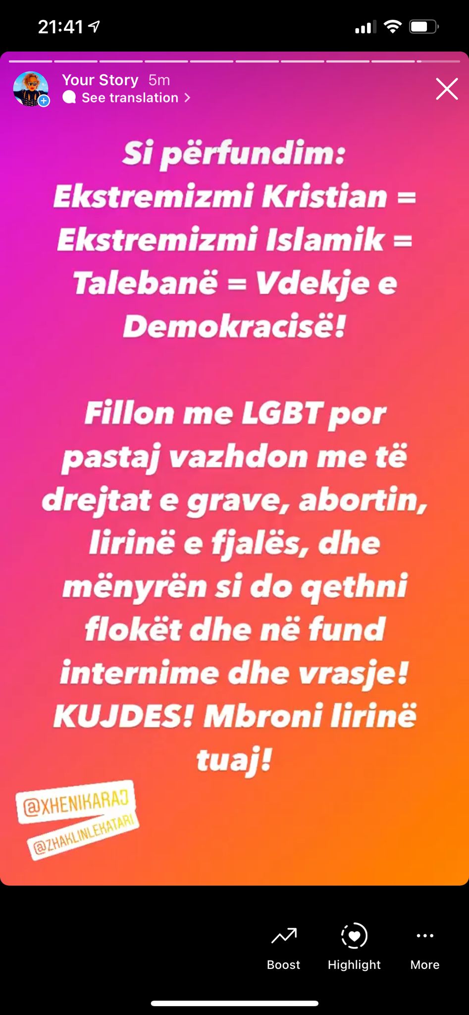 Ajo madje ka postuar foto duke u puthur me të dashurën pikërisht para godinës së Kishës. Ata kanë shkuar të dëgjojnë dhe gazetaren italiane Nausica della Valle, e cila ka qenë lezbike por hoqi dorë nga kjo jetë, pasi njohu Zotin. Postimi i plotë; Erdhëm me mendjen e hapur se mos ndryshonim duke dëgjuar Akilin, por hiç… Mbetem lezbike e gej! Dëgjuam te premten ftesën e Akilit për te frekuentuar Kishën e tij, ndaj erdhëm sot ta dëgjojmë me veshët tona fjalën e Perëndia Erdhëm me mendje dhe zemër te hapur.