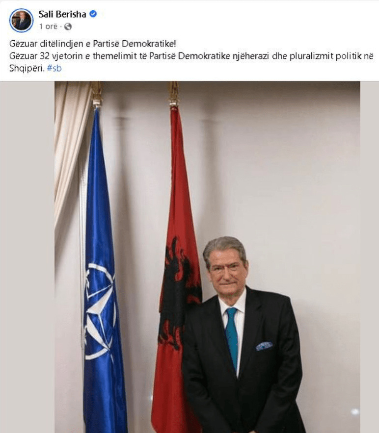 Gëzuar 32 vjetorin e themelimit të Partisë Demokratike njëherazi dhe pluralizmit politik në Shqipëri’, shkruan Sali Berisha në një postim në Facebook.