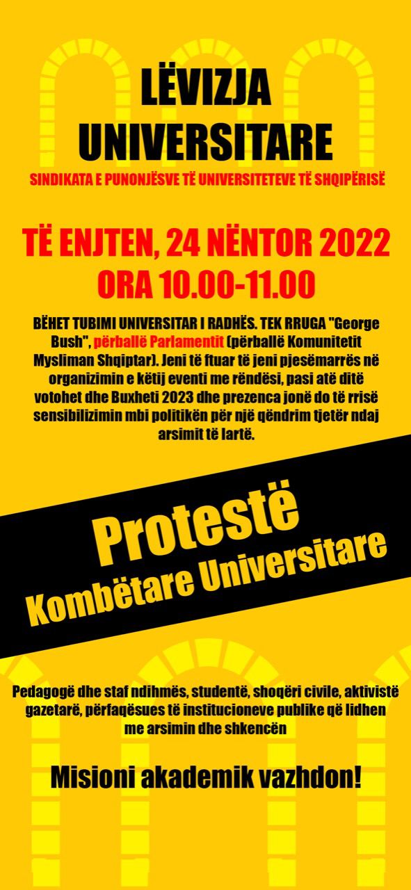 Lëvizja universitare, Sindikata e Punonjësve të Universiteteve të Shqipërisë ka njoftuar se të enjten, më 24 nëntor ora 10:00-11:00 do të ketë një tubim përballë parlamentit duke ftuar të gjithë pedagogët dhe punonjësit e universiteteve të marrin pjesë me qëllimin e rritjes së sensibilizimit mbi politikën për një qëndrim tjetër ndaj arsimit të lartë.