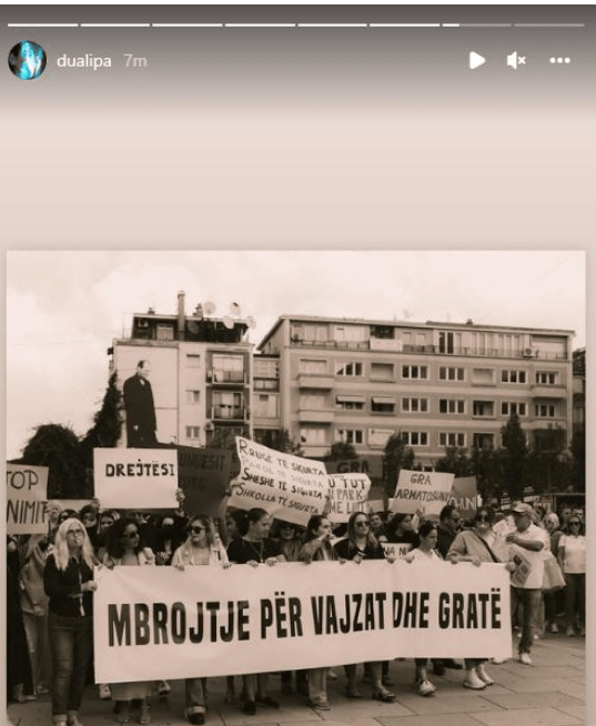 “Mbrojtje për vajzat dhe gratë”, “Drejtësi”, “Rrugë të sigurta”, “Gra të armatosura”, thuhet në disa prej pankartave që protestueset mbajnë në dorë në foton e publikuar nga Dua Lipa.