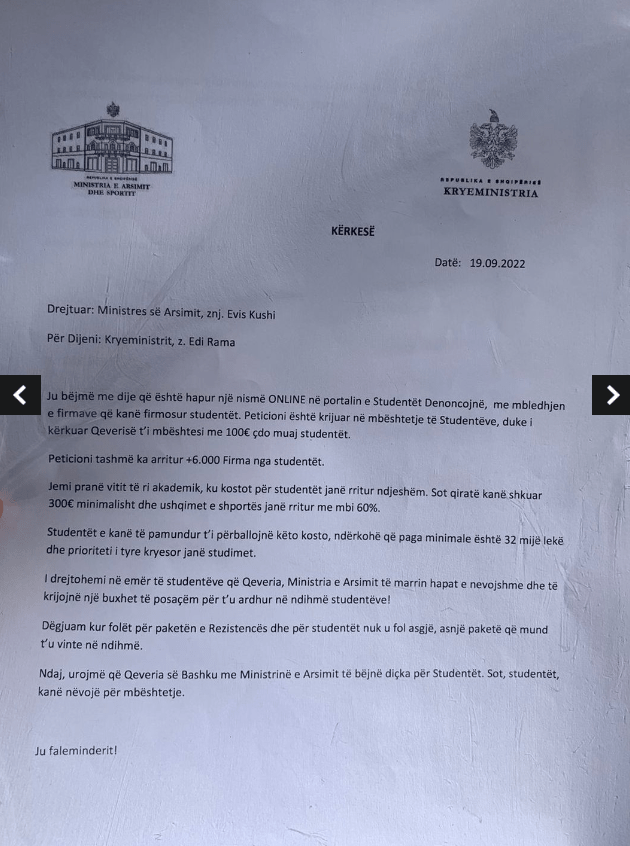 Mësohet se deri më tani janë mbledhur mbi 6000 firma, ndërkohë që studentët kërkojnë 100 euro çdo muaj nga qeveria.