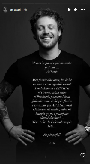 “Meqenëse po më vijnë mesazhe pafund….Atëherë: Mes famës dhe artit, ka kohë që unë kam zgjedhur artin! Produksionet e BBVIP, si në Tiranë ashtu edhe Prishtinë, po ashtu i kam falenderuar me kohë për ftesën e tyre mirëpo, Art Abazi është i fokusuar në studio, edhe në këngët që po punoj me shumë dashuri…Nëse një ditë do të vlerësohem për këtë…Ju përqafoj, Arti”, ka shkruar artisti.