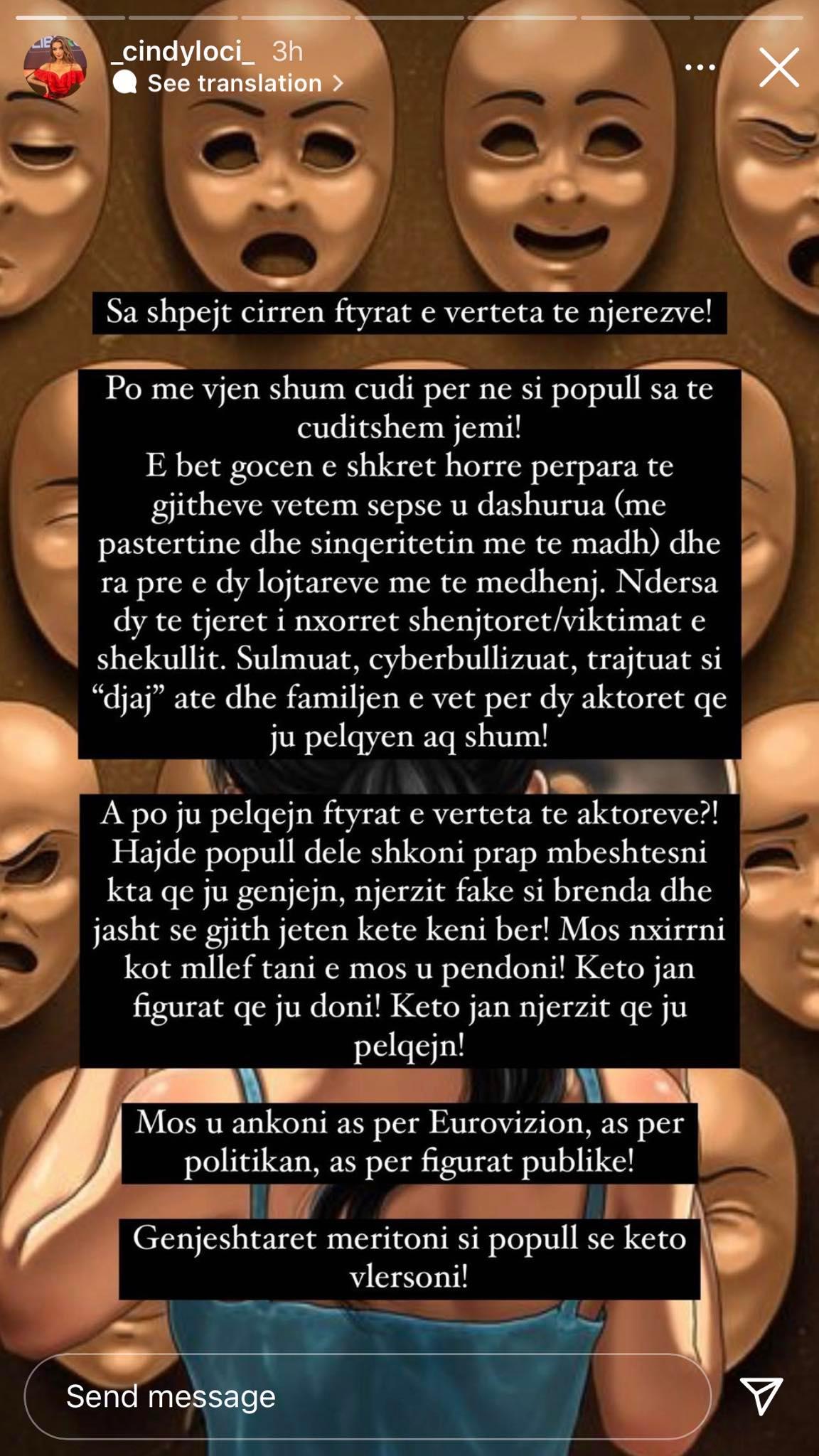 “Sa shpejt çirren fytyrat e vërteta të njerëzve! Po më vjen shumë çudi për ne si popull sa të çuditshëm jemi! E bëtë gocën e shkretë horr përpara të gjithëve vetëm sepse u dashurua (me pastërtinë dhe sinqeritetin më të madh) dhe ra pre e dy lojtarëve më të mëdhenj. Ndërsa dy të tjerët i nxorët shenjtorët/viktimat e shekullit. Sulmuat, cyberbullizuat, trajtuat si “djaj” atë dhe familjen e vet për dy aktorët që ju pëlqyen aq shumë! A po ju pëlqejnë fytyrat e vërteta të aktorëve?! Hajde popull dele shkoni prapë mbështesni këta që ju gënjejnë, njerëzit fake si brenda dhe jashtë se gjithë jetën këtë keni bërë! Mos nxirrni kot mllef tani e mos u pendoni! Këto janë figurat që ju doni! Këto janë njerëzit që ju pëlqejnë! Mos u ankoni as për Eurovizion, as për politikanë, as për figurat publike! Gënjeshtarët meritoni si popull se këto vlerësoni!” –shkruan Sindi.