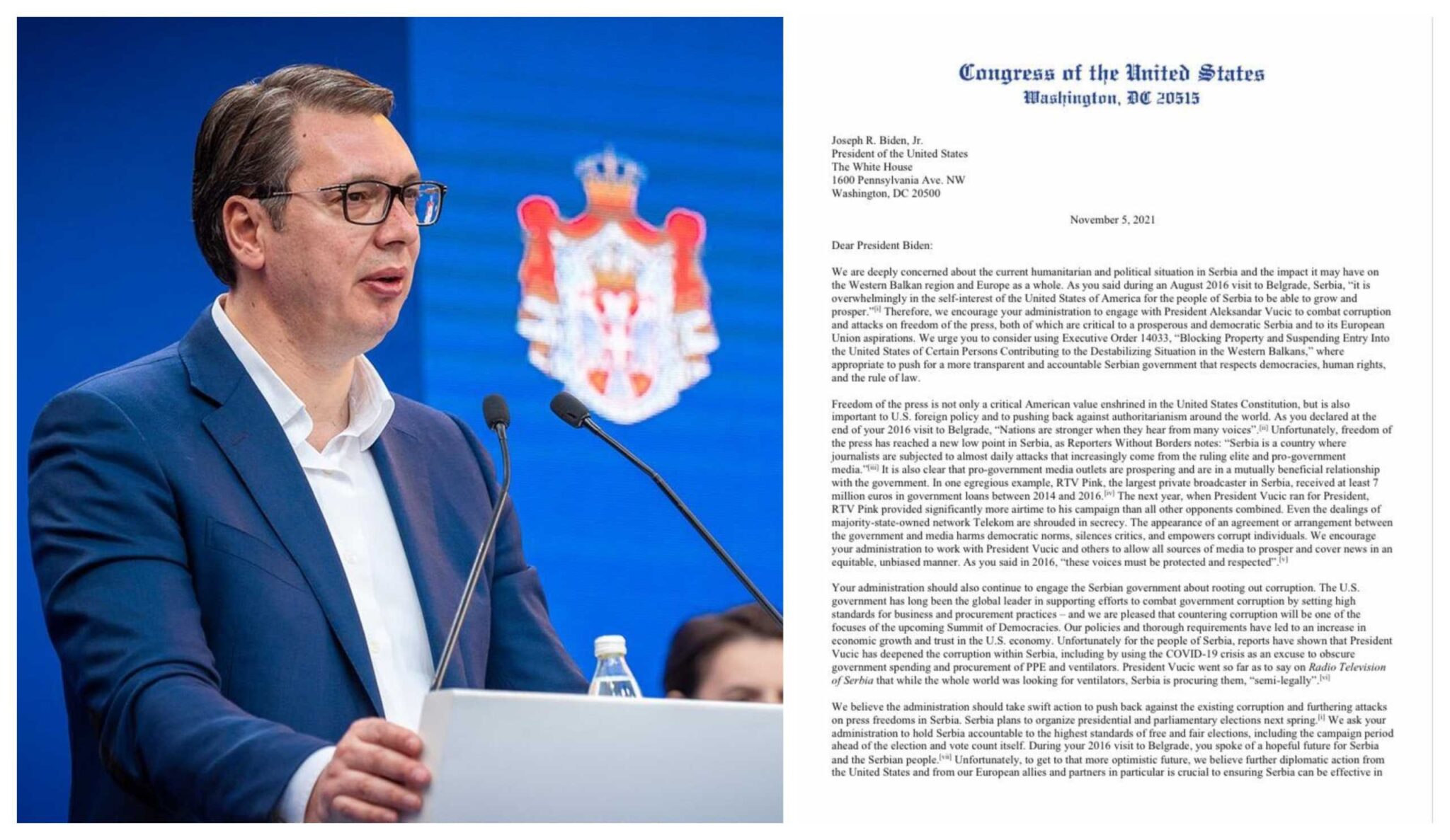 ‘Raportet tregojnë se Presidenti Vuçiç e ka thelluar korrupsionin në Serbi, duke përdorur krizën e COVID-19 si justifikim për shpenzimet e qeverisë’, thuhet në letrën e dërguar Presidentit të SHBA më 5 nëntor.