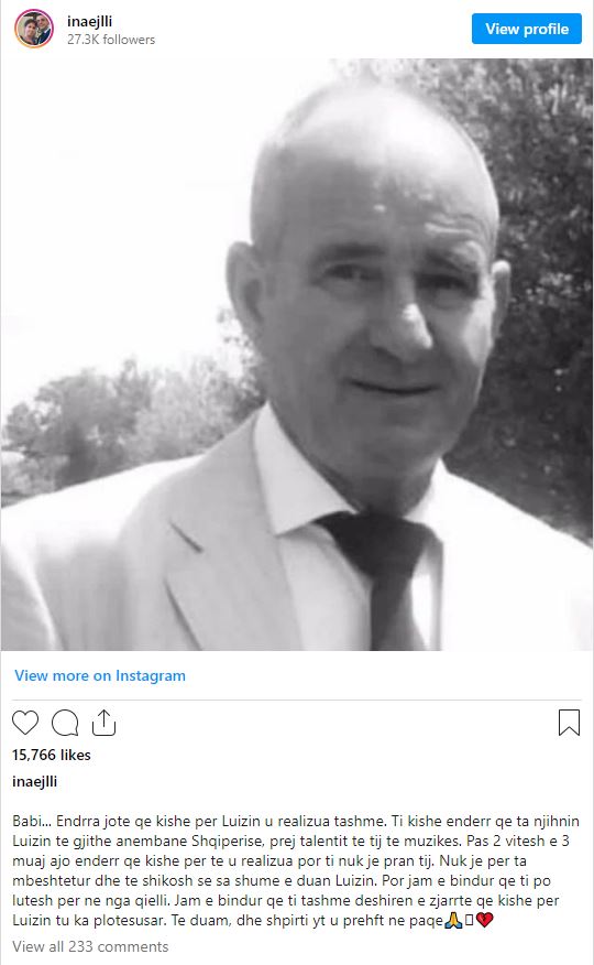 Një postim të bërë në profilin e tij në Instagram, motra e Luizit ka shkruar se ëndrra e babit të tyre edhe pse nuk jeton është realizuar sepse gjithmonë ka dashur që djali i tij të jetë një ditë i njohur për talentin e tij në muzikë.