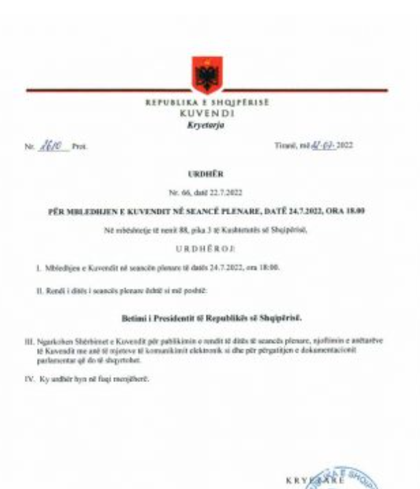 “Ngarkohen shërbimet e Kuvendit për publikimin e rendit të ditës së seancës plenare, njoftimin e anëtarëve të Kuvendit me anë të mjeteve të komunikimit elektronik si dhe përgatitjen e dokumentacionit parlamentar që do të shqyrtohet”, thuhet në urdhrin e Lindita Nikollës.