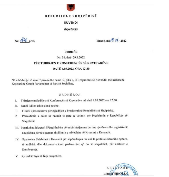 Konferenca e Kryetarëve do të mblidhet më 4 Maj, në lidhje me çështjen e presidentit të ri.
