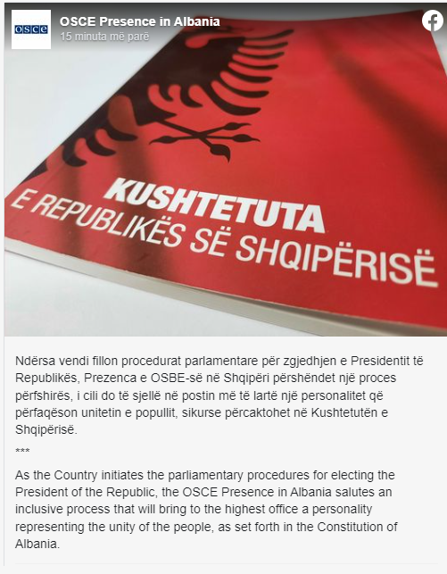 “Ndërsa vendi fillon procedurat parlamentare për zgjedhjen e Presidentit të Republikës, Prezenca e OSBE-së në Shqipëri përshëndet një proces përfshirës, i cili do të sjellë në postin më të lartë një personalitet që përfaqëson unitetin e popullit, sikurse përcaktohet në Kushtetutën e Shqipërisë”, shkruhet në njoftim.