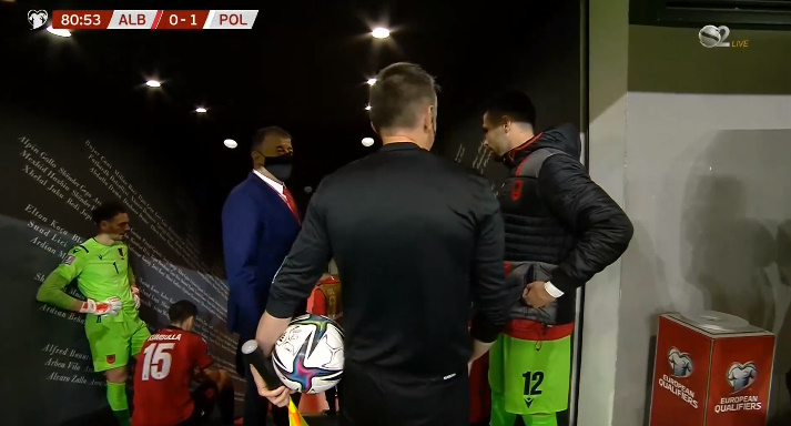 Goli ka tensionuar tifozët kuqezinj në stadium, të cilët kanë goditur futbollistët polakë me shishe. Kjo ka bërë që gjyqtari të ndërpresë menjëherë ndeshjen.
