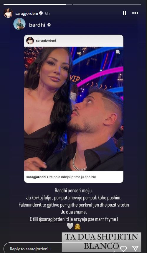 Këngëtari i njohur, Bardhi ka rimarrë rrjetin e tij social pas prishjes së marrëdhënies me menaxherin, Jetmir Agaj, për shkak se ky i fundit ishte kundër lidhjes me Sara Gjordenin, romancë e cila nisi në shtëpinë e Big Brother Vip. Pasi ka marrë rrjetin social, në postimin e parë, Bardhi i ka bërë një dedikim romantik partneres së tij dhe shkruan: “E ti Sara Gjordeni, je arsyeja pse marr frymë”.