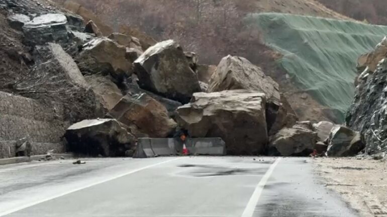 Pamjet nga vendi i ngjarjes tregojnë degradimin e shpejtë të një vepre që sapo ishte inauguruar, masa gjigande shkëmbore të rrëzuara mbi asfalt, barriera të shtrembëruara si fletë kartoni dhe një segment i tërë, i shkatërruar brenda pak sekondash.