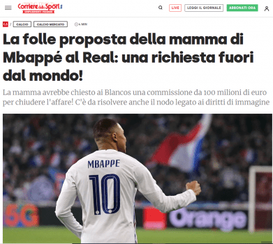 Mamaja e tij, Fayza Lamari, njëkohësisht edhe agjente e Mbappe, i ka kërkuar Real Madrid 100 milionë euro komision për të dërguar djalin e saj në kryeqytetin spanjoll.