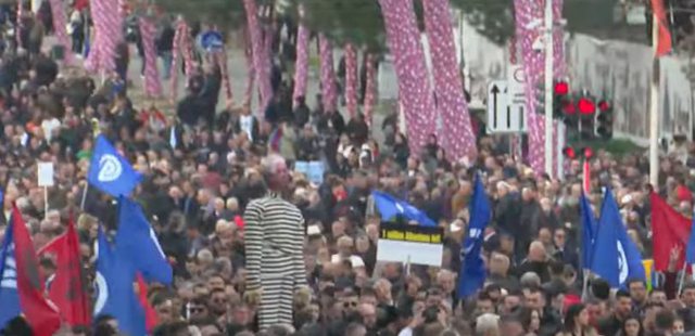 Me flamujt e Partisë Demokratike dhe flamujt kuqezi, protestuesit janë bashkë me kryedemokratin Sali Berisha për të protestuar poshtë zyrës së Ramës.